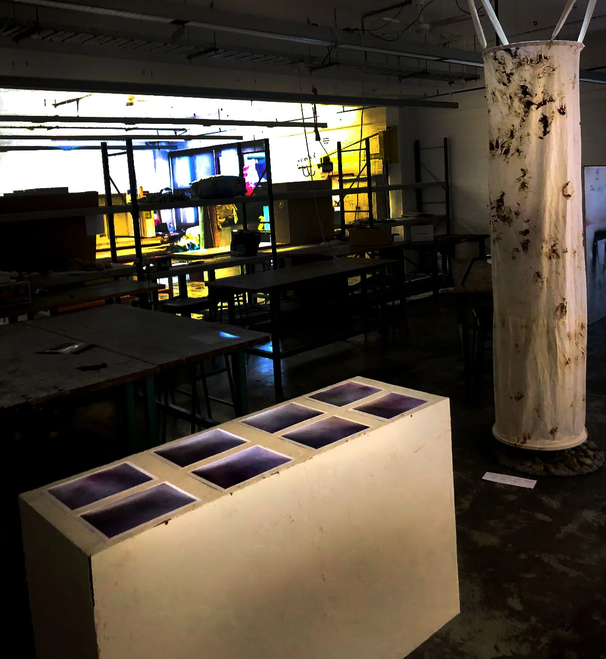 'Rolling in the deep' looks at these issues in a more serious way. The relational installation, designed to be disorientating and painful, is meant to show audience the world from the point of view of mother nature. As you step onto the sharp rocks in the gallery, you are transported to Fowlers Gap. A white mass rolls over the sharp rocks of a dry creek bed, as though flowing through the space like water. However, instead of seamlessly flowing through the space, the action is jagged and painful, and replaying endlessly on repeat. These actions, alongside the photographic evidence of these actions, bring forth notions of suffering and abuse, yet also willingness to persist, and survive.